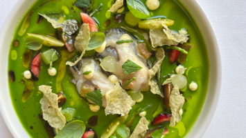 Ostrica Cadoret Tsaritsa, ciliegie, pomodoro verde, cetriolo e misticanza di erbe