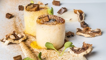 Cilindri di patata ripieni di Crème Brulé da grana padano riserva, uovo di quaglia caramellato, champignon disidratati, farina di porcini e champignon, brunoise di tartufo nero glassato