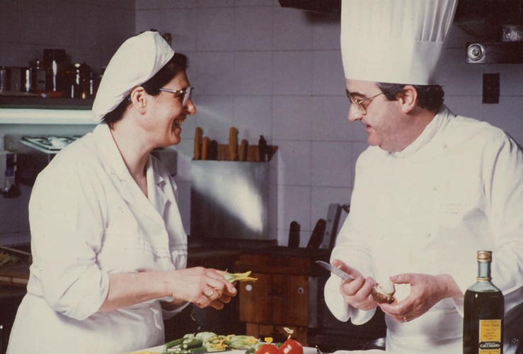 Nel ristorante di Cesare Aimo ebbe dallo chef la possibilità di realizzare due piatti al pomeriggio, guardando e controllando gli ingredienti della spesa. Era un modo per coinvolgere l’apprendista a prendere finalmente coscienza delle proprie capacità: fare la spesa al mercato, in pescheria e dal macellaio erano state lezioni di cucina inconsapevoli, che il cocinatore napoletano voleva che fossero recepite del tutto. Ora stava ad Aimo dimostrare di aver capito. «Era una scuola non didattica, in cui si studiava poca teoria e ci si applicava in tanta pratica. Al contrario di oggi, che molti istituti alberghieri optano per un’educazione più teorica che pragmatica!». Nel tempo quindi Aimo ha incominciato con i fritti, poi diventò un capo partita che sapeva fare molte cose. Il segreto di tanto apprendimento? Libri di cucina e tanta prassi in cucina. Cambiando ristoranti assunse finalmente la posizione di sous chef, nei luoghi migliori di Milano per la cucina toscana. «Con la mia bici Doniselli pedalavo fino al mercato e al macello comunale, in compagnia di un amico macellaio che mi erudiva in materia. Il 17 giugno 1955 formulai il mio primo menu, redatto con una macchina da scrivere Olivetti e carta carbone, come era solito fare Indro Montanelli. Un’ora per trascrivere dodici menu! Posso ancora percepire l’entusiasmo di quel momento, poiché ho caramente conservato quel menu al ristorante». Nel 1957 incontra Nadia, l’amica d’infanzia e vicina di casa, che era arrivata a sua volta a Milano: diverrà non solo sua moglie, ma anche compagna di vita e di lavoro. In quegli anni tuttavia Aimo saltava da una gestione all’altra, scappando dalla negligenza, dall’ignoranza e dall’inadeguatezza dei vari titolari, che avevano sì il capitale, ma poca esperienza culinaria. Lavorò a Milano e provincia e a Viareggio, mentre aspettava qualcosa di più consistente: una licenza per un ristorante tutto suo. Intanto raffreddava i vini coi mastelli di ghiaccio, accendeva le stufe, si erudiva sui prodotti migliori del suo magico Paese: «Io e un amico toscano mediatore giravamo per Milano con una Vespa 125 con cambio a bacchetta, per vedere dei locali in vendita; ma la mia piccola somma come acconto era modesta, quindi nessuno accettava. Finché trovai un posticino in via Montecuccoli, in una strada senza asfalto nella cruda e ancora contadina periferia milanese; accettai subito perché avevo una voglia pazza di incominciare qualcosa di totalmente mio. Correva l’anno 1962. Insieme alla mia Nadia dunque dammo alla luce il ristorante “Il Luogo di Aimo e Nadia”». I primi clienti furono gli operai che lavoravano nelle industrie limitrofe, e il piccolo gruzzoletto iniziale fu investito nella prima ristrutturazione: sulle prime era infatti un modesto bar con gioco di bocce, con mansioni ristorative da piccola trattoria, ma la cucina era arricchita da pesciolini fritti, nervetti, Mondeghili, polpette, ecc. Ristrutturata la piccola cucina e indi la sala, la passione e la voglia di lottare ripresero incessanti. Negli anni ’70 il critico Edoardo Raspelli scrisse: “Una trattoria toscana, ma non è la solita musica!”. «Che momento incredibile, che eccitazione. Avevo una meravigliosa donna affianco a me, in cucina, un ristorante in evoluzione che incominciava a incassare consensi. Cosa mancava veramente? Mi ricordo che dissi: “Nadia, noi dobbiamo fare una ricerca spasmodica della qualità! Dobbiamo trovare la miglior carne, insalata, olio e burro. La qualità ci ripagherà!». E così in effetti accadde.