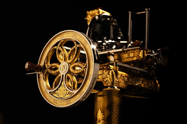 Il respiro dell’Art Nouveau e le finezze dello Jugendstil aggiungono ulteriore magnificenza, mentre l’oro e i decori in ottone placcato d’oro rendono questa affettatrice un autentico gioiello da esposizione, oltre che uno strumento di impeccabile funzionalità. Nulla è lasciato al caso: persino i dettagli cromatici, con i loro giochi di riflessi, contribuiscono ad arricchire l’opera.