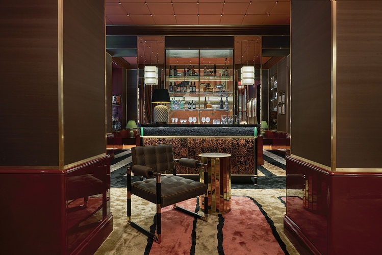 Il progetto di interior design, affidato a Giuseppe Porcelli, ha puntato alla creazione di una vera e propria “casa” ricreando le principali aree di una abitazione privata in un ambiente raffinato e avvolgente. Oltre il vestibolo di ingresso si trova un doppio salotto. La prima area presenta uno spazio di accoglienza centrato attorno a un bar e a una coppia di tavolini da cocktail. Segue la zona lounge, dominata da un grande divano club di tessuto bordeaux e illuminata da tre imponenti lanterne in tessuto rosso disegnate su misura. Il vero cuore del progetto è ovviamente la sala da pranzo, al cui centro si erge un lungo tavolo in legno di ciliegio, con gambe in vetro ambrato, progettato appositamente per Langosteria.