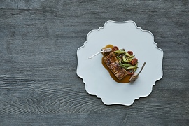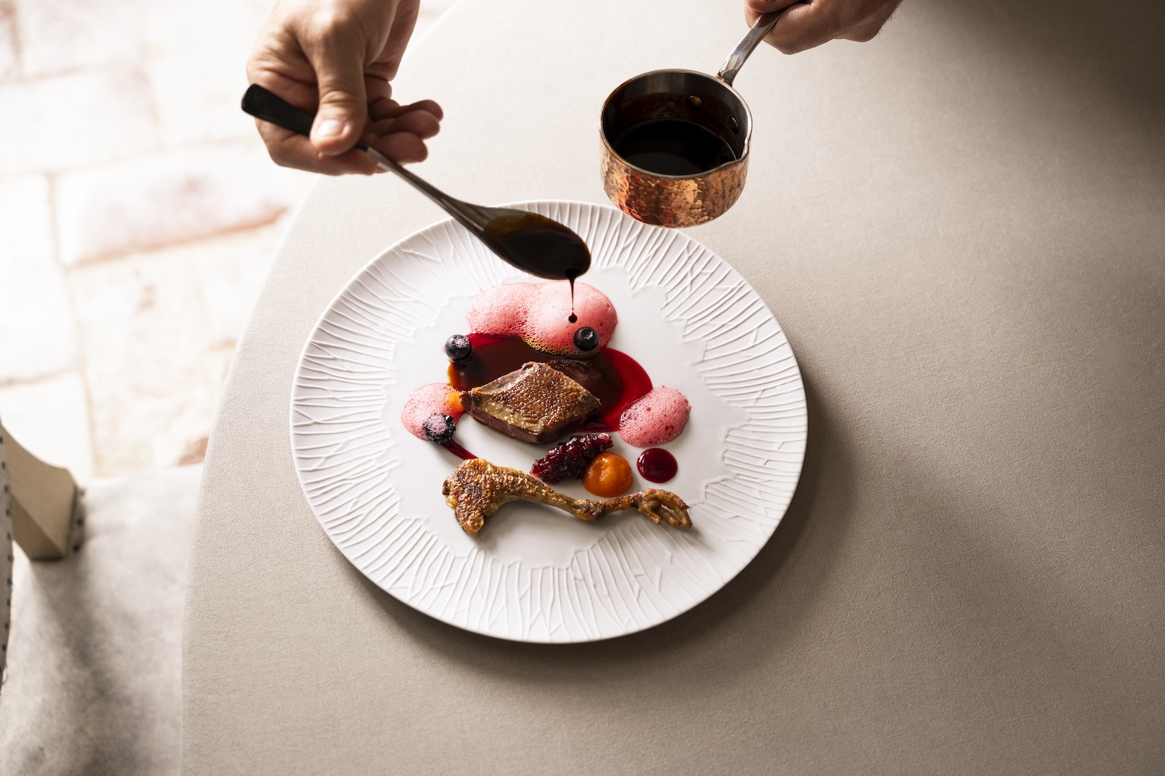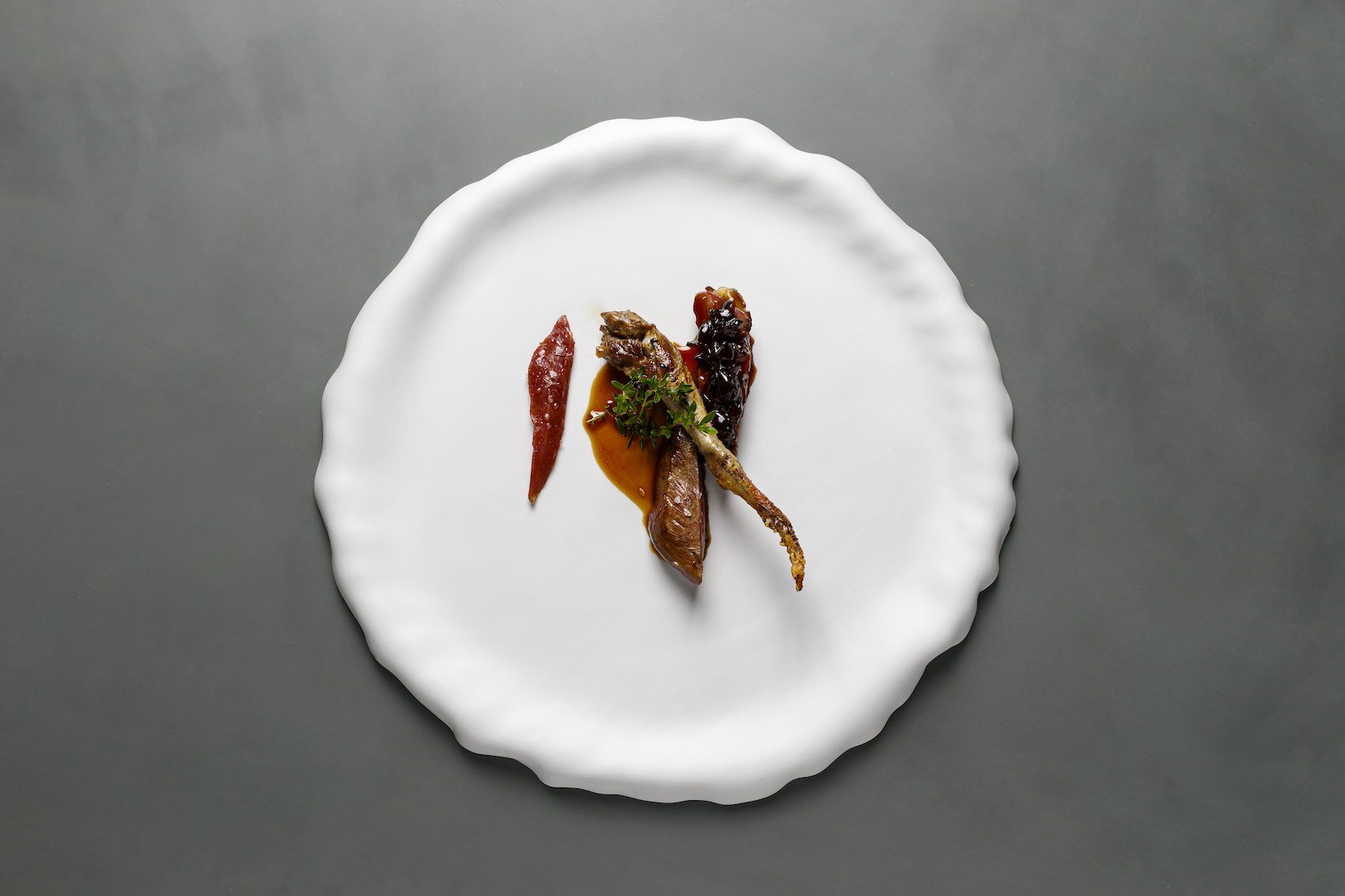 La materia prima è sicuramente il punto di partenza, con la possibilità di approvvigionarsi nelle filiere del luogo, come per esempio la carne di Simone Fracassi dai bovini agli agnelli del Casentino, poi da Laura Peri il celebre piccione e anche le faraone, usate per il ripieno dei bottoni serviti con un’estrazione di scampi. «La clientela internazionale è connotante e io dal primo giorno ho sempre avuto la medesima impostazione sulle ricette della tradizione facendo anche provare nuove carni e nuovi piatti a ospiti che prima non avevano mai assaggiato, con grande soddisfazione lato mio e con grande stupore di godibilità dal loro punto di vista. Parlando del piccione, per esempio, nostro grande classico largamente apprezzato anche dai non autoctoni, la coscetta confit, finalizzata in yakitori con il carbone Binchotan che le dona un sentore delicato di fumo, e una consistenza cremosissima, benché ruspanti, con tecniche imparate nei miei trascorsi in Francia».