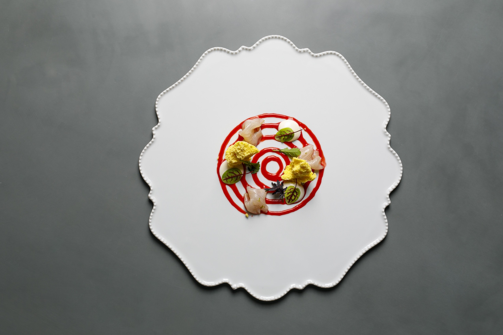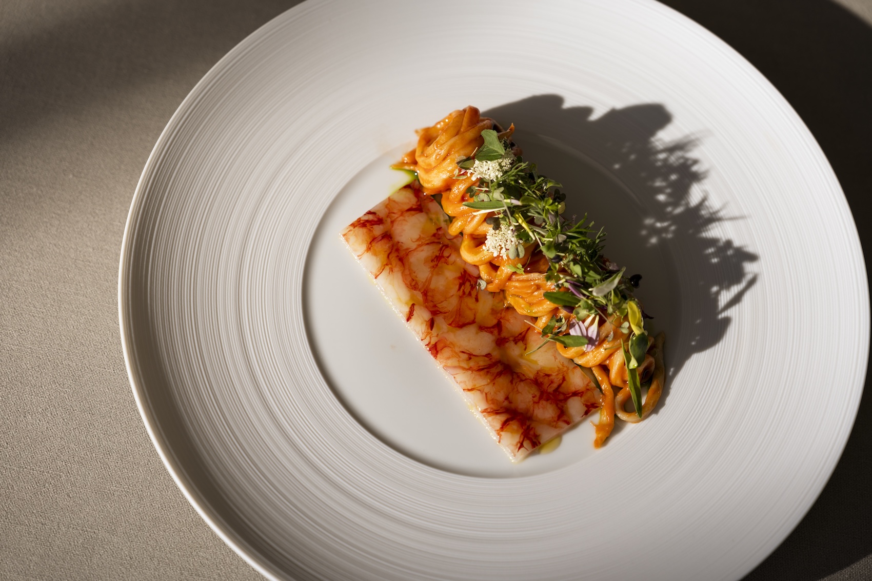 I primi non possono mancare e un piatto in particolare racconta la visione di chef Giovanni: «I nostri pici del ristorante La Torre, oltre a essere fatti a mano come da tradizione, sono un personalissimo esercizio di stile che partendo dalla Val D’Orcia (terra natia di mia moglie) arriva sui mari. Si parte con l’aglione abbinato però allo iodio del gambero rosso e finalizzandolo con un curry thailandese addolcito con latte di cocco e in aggiunta l’essenza delle teste dei gamberi rossi, accompagnato con due falde di gambero rosso pressato e leggermente marinato in olio, sale e limone, senza coprire la dolcezza e i sentori iodici del gambero; partire dal territorio per giungere in coste lontane; o viceversa, dato che questo piatto è stato servito anche nel nostro pop up al COMO Parrot Cay con i pici realizzati a mano sull’isola».