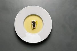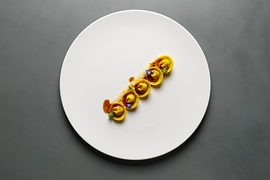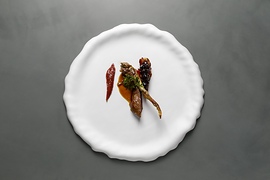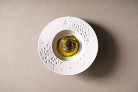 Per necessità o per virtù che dir si voglia, c’è molta attenzione anche alle restrizioni alimentari preferendo in alcuni casi i legumi al grano e ne è un perfetto esempio la zuppetta che trae origine dalla farinata toscana, aggiungendo ai ceci, fagioli, piselli, lenticchie rosse, pomodoro, componente spicy e latte di cocco, poi servita con una griglia di farina di ceci e povere di barbabietola in cui si sostanzia in una amouse bouche che racchiude l'idea fondante dello chef.