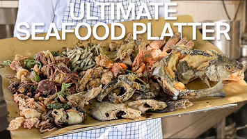 Cuocere il cefalo sulla griglia, tagliarlo a pezzetti e condire con olio EVO, pepe nero e prezzemolo tritato. Adagiarlo sul piatto insieme ai gamberetti.