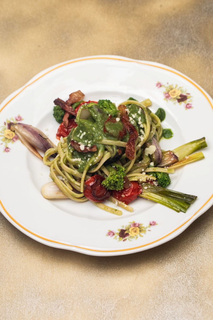 E così, in nome della stagionalità e microstagionalità di inizio autunno, Franco unisce i sapori emiliani di stalle e orti sotto l’egida di una linguina Al Bronzo Barilla, che ben aggancia l’intingolo. Il cipollotto fresco viene cotto intero, i primi broccoletti vengono cotti e i gambi frullati a formare una crema che fa da base al tubero, al guanciale saltato in padella e agli ultimi pomodori della stagione appena scottati. Tutte cotture espresse per un piatto che profuma di orto, delle ultime propaggini di un autunno che si invena nell’estate dell’incontro tra due regioni che per Franco sono un sentimento, Emilia e Abruzzo, coronato con unan spolverata di pecorino, a dare il perfetto equilibro a irresistibili forchettate.