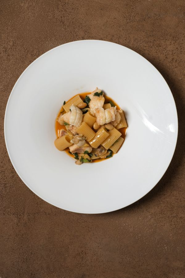 In nome della grande materia prima e della toscanità, Angiolo abbraccia il gusto toscano che si dipana dall’entroterra alla costa e che omaggia il concetto di zuppa di terra e di mare in un unico piatto, i Mezzi Rigatoni e Fusilli al Bronzo “Barilla”, in Zuppetta di Pesce di Scoglio, Molluschi, Fagioli Zolfini della Val di Chiana e Cavolo nero.