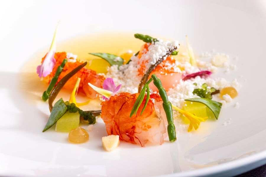 Così nasce una carta che ha assunto una forte impronta spagnola: prodotti locali e mediterranei si intrecciano in piatti dal linguaggio contemporaneo, capaci di unire tecnica e memoria. Tra le creazioni più rappresentative compaiono preparazioni come il Gambero rosso con formaggio di capra, dashi di Jamón Ibérico, insalata di alghe e mandorla, o la Tartare di calamaro con guisantes del Maresme, tuorlo ed emulsione di mandorle e baccalà, che raccontano chiaramente tutto il percorso di Sacchi e il legame con la cultura gastronomica che lo ha formato.