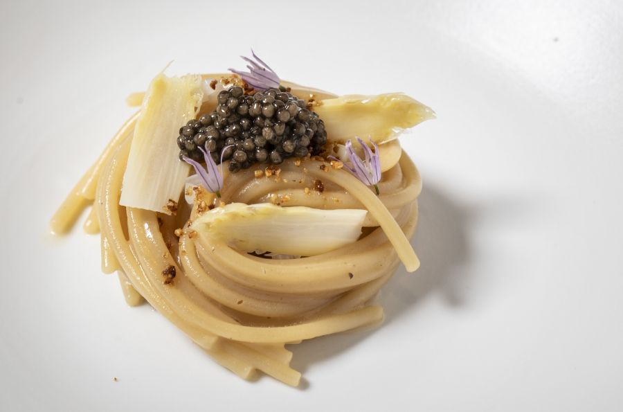Per il progetto Barilla Al Bronzo invece, ha creato gli Spaghettoni con colatura di alici, asparago bianco, caviale e caffè. «Prediligo la pasta trafilata al bronzo per la sua matericità: la porosità, la tenuta, la capacità di assorbire il condimento. Amo toccarla, sentirne la consistenza e il profumo del grano. E quando cerco conforto, torno sempre a un piatto di pasta in bianco, semplice, condito solo con olio». In queste parole c’è tutta la filosofia di Lorenzo Sacchi: la purezza del grano che parla da sé, senza artifici. Proprio come la sua cucina.