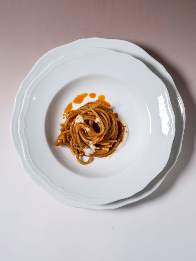 Il pomodoro, ancora con il suo gambo e le foglie, viene prima infornato, poi frullato e trasformato in salsa, profumata con origano. A completare il condimento, una fonduta di pecorino, per una preparazione rimasta sostanzialmente immutata dal 1956. L’unica evoluzione è l’aggiunta più recente della ’nduja, che introduce una nota piccante e aromatica capace di intensificare il gusto, firmarlo e renderlo profondamente identitario.