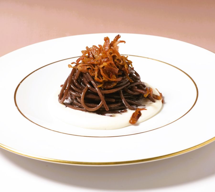 La Capitale, nello specifico Trastevere, sono state le quinte dei primi impasti di Diego, che produceva, insieme alla nonna, dei tonnarelli che inondavano la casa di un profumo inconfondibile, mentre seccavano. La pasta, per lui, è il cuore pulsante della tavola italiana: è democratica, versatile e capace di unire tradizione e innovazione. La pasta fresca rappresenta l’artigianalità e il territorio, mentre quella secca è la spina dorsale della cucina quotidiana. A Tenuta di Polline, il nostro cuoco ha sempre dei primi piatti in carta, tra cui spiccano gli Spaghetti alla Carbonara di Lago (con guanciale sabino, pecorino romano, uova bio della Tuscia e una polvere di coregone affumicato) e i Tonnarelli freschi al cacio affumicato e 5 Pepi. Per Barilla Al Bronzo ha invece pensato a “Bronzo Romano”: un piatto che unisce la cucina storica di Roma e il territorio di Bracciano. Vengono usati gli Spaghetti Quadrati Barilla Al Bronzo, cotti in acqua salata con un infuso di erbe romane (rosmarino e salvia) e conditi con un guanciale croccante rosolato, pecorino grattugiato e un’emulsione di pomodorini semi secchi e filetti di luccio affumicato. È un omaggio alla pasta secca come tela bianca, dove la trafilatura al bronzo amplifica l’assorbimento dei sapori, ma senza appesantire: anche questa è arte.