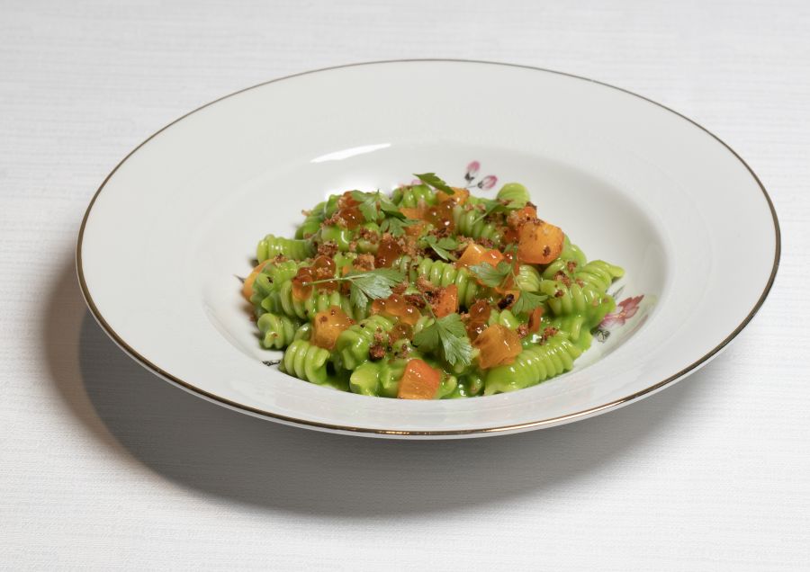 Per Barilla Al Bronzo ha creato dei Fusilli con pesto di levistico, caco mela marinato, briciole di pane e uova di trota. La temperatura di servizio è fondamentale per gustare gli elementi nella loro vera natura: deve essere, perciò, tiepida. Il piatto nasce da un istinto: Fabio se l’è immaginato in bocca ancora prima di mangiarlo, secondo quello che è il suo concetto di golosità. Il sentore di liquirizia del levistico si sposa bene con il caco, che resta acidulo, mentre le uova di trota regalano una giusta sapidità. Qui dentro c’è tutto Fabio Pellicardi: un ragazzo diretto, affabile e con uno spiccato sesto senso per i gusti che sa regalare la natura.