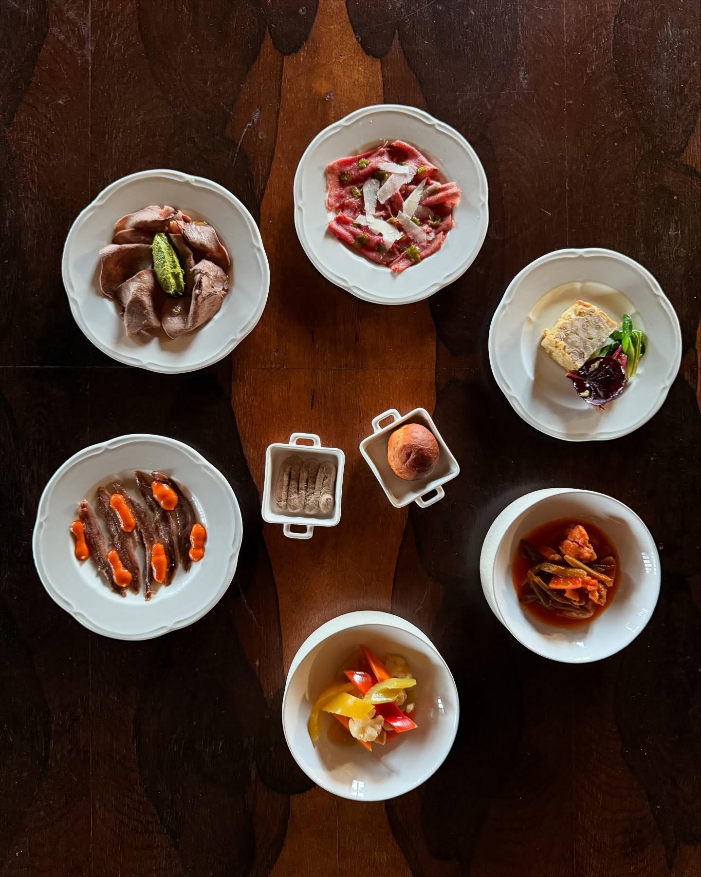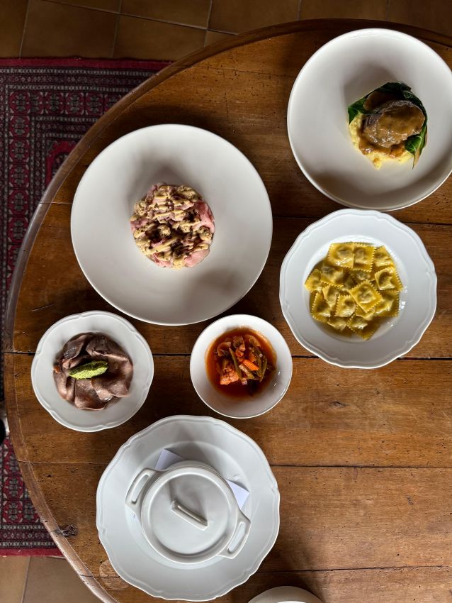 L’inizio e la fine dei pasti sono caratterizzati rispettivamente dalla possibilità di scegliere da un Carrello dei salami e da uno dei formaggi, con più tipi in degustazione. Nel mezzo, arrivano piatti vegetali, di terra o di mare, con gli speciali del giorno raccontati su una grande lavagna, tra cui si distinguono la Ritorno al futuro (rivisitazione dell’insalata russa), l’Arrosto crudo, i Rabaton di erbe selvatiche, la Finanziera o il dessert Notti al Bar Dante. Una persona tanto legata alla tradizione come Federico non poteva non avere un ricordo forte sulla pasta, da cui è nato un amore duraturo: «La pasta rappresenta l’inizio del mio percorso in cucina. È tra le prime ricette che si imparano e a cui ci si approccia con curiosità e rispetto. Ricordo ancora l’emozione del mio primo vero contatto con il fuoco delle cucine professionali: a 15 anni, saltare la pasta era il massimo dell’ambizione, una cosa entusiasmante! Preferisco utilizzare la pasta fresca per ricette di pasta farcita, mentre la pasta secca è protagonista di piatti ispirati ai miei viaggi».