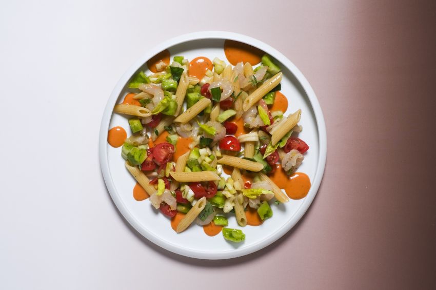 La summa delle due definizioni appena citate si rintraccia nell’Agnolotto Quadro Monferrino (preparato con parti nobili del maiale, fassona a crudo, scarola e borragine ripassate e maggiorana) e in Alassio, uno spaghettone dedicato alla città ligure (con soia di loro produzione, gamberetti di Savona, cipolla dorata e cagliata di capra locale). La Liguria e le origini tra mare e terra del nostro cuoco escono anche nei due piatti pensati per Barilla al Bronzo. Il Fusillone al Bronzo Barilla alle Erbette e Cagliata Ligure pone attenzione al vegetale, in cui lo chef crede fortemente, e all’entroterra, mentre con le Penne Rigate al Bronzo Barilla alla Catalana (con coulis di cuore di bue, datterino giallo e pomodoro verde acerbo, sedano, olio al cipollotto, gamberi conditi con olio e menta) lo sguardo si perde nel blu del mare, sempre presente, anche sulle alture di Cremolino.