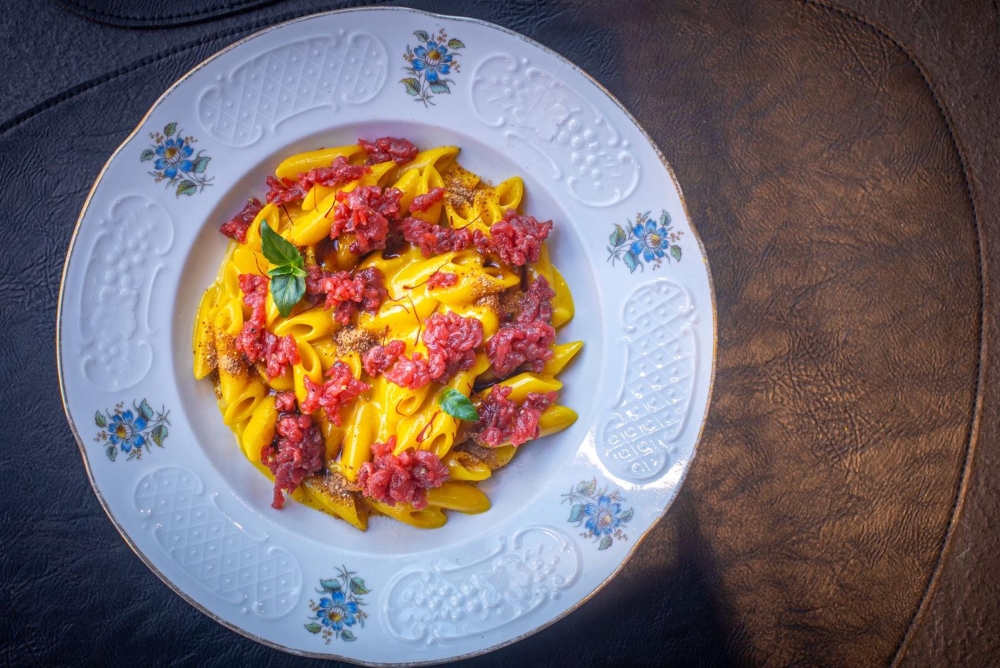 E la pasta? Curiosamente, il menu che Edoardo ha strutturato non sottintende alla divisione tra antipasti, primi e secondi, perché la pasta deve essere al pari di tutti gli altri piatti (Spaghetto burro e alici con aromi stagionali, Spaghetto con datterino giallo, vongole, latte di cocco, cipollotto e peperoncino fresco, Candele con zucca, caprino e cavolo nero, con spolverata di pimenton). Per Barilla Al Bronzo, Edoardo Conti ha pensato alle Penne con burro acido, brodo e pistilli di zafferano, fondo di agnello e crudo di agnello: l’idea è quella di rievocare la succulenza del riso allo zafferano, con l’intensità data dal fondo e un gioco caldo/freddo con la carne di agnello locale. Al di là della preparazione gourmet, questo primo sottolinea quanto sia bello e appagante mangiare qualcosa di noto, ma traslato in un’altra forma, grazie alle Penne, che richiamano quel concetto di comfort food tanto caro al format di Gusta.