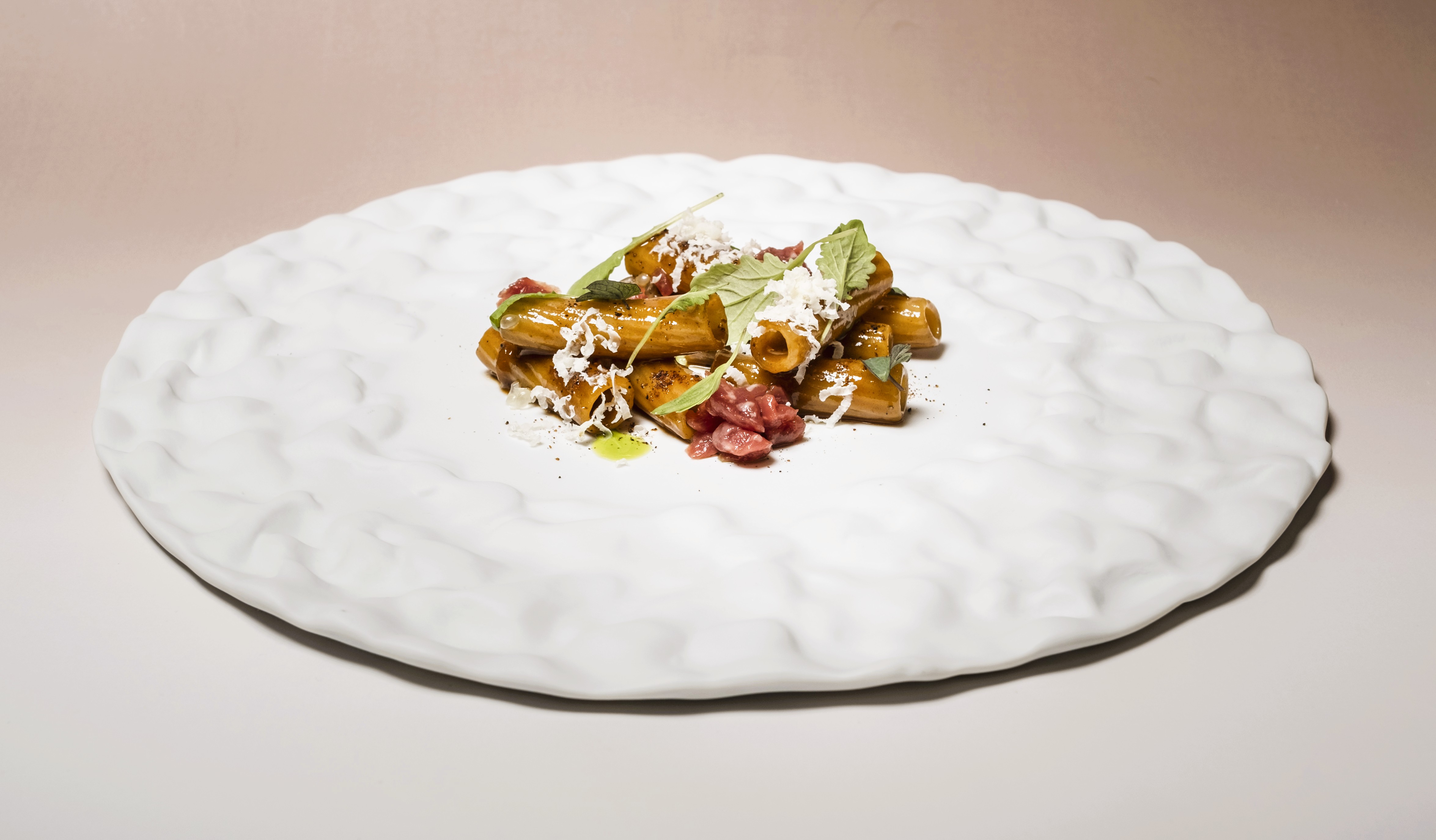Nascono così piatti che condensano due continenti: Linguine con trota e brodo di cocco e ananas, o il Tortiglione con genovese di pecora e note asiatiche di finger lime, ricotta stagionata e dragoncello dal suo orto, questi ultimi pensati per il progetto di Barilla Al Bronzo