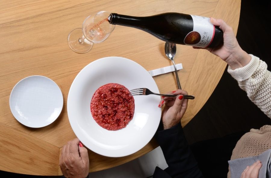 Lo racconta bene Profondità, il menu che esplora il mare a partire dalla riva, tra alghe, piante aromatiche e materie prime che definiscono l’identità di Impronta d’Acqua. Nella stessa direzione si inserisce il lavoro sullo scarto zero, ben rappresentato dallo Spaghetto al Bronzo Barilla: la pasta viene cotta in un brodo ricavato dagli scarti di seppia di un piatto appartenente allo stesso percorso di degustazione, quindi condita con triglia cruda, una spremuta di triglia piccante ed erba cipollina. Il risultato è un morso deciso, che amplifica le note iodate e introduce un’ulteriore stratificazione gustativa.