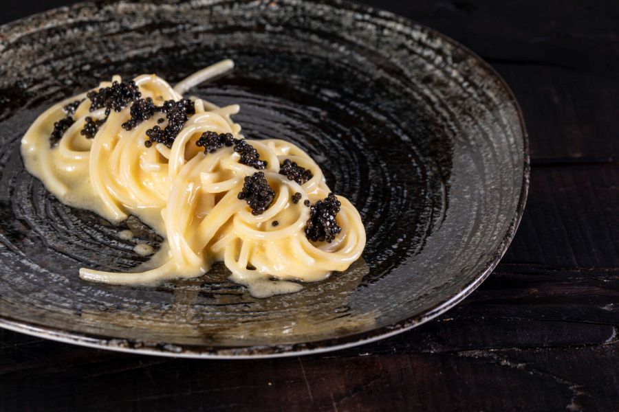 Studio e passione per la materia prima hanno portato Simone a voler lavorare anche per sottrazione, unendo pochi ingredienti in nome della profondità del gusto. E l’esempio del maestro Marchesi gli è giunto a puntino per unire la pasta secca e il caviale che è uno dei fiori all’occhiello del ristorante, e a cui è dedicata una carta speciale di degustazione di varie specie dell’azienda Giavieri. Caviale italiano di altissimo pregio che Simone non si accontentava solo di far gustare con pane e burro, portandolo così a diventare un primo piatto, come Marchesi insegna.