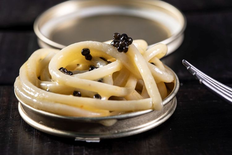 Spaghetto quadrato Al Bronzo Barilla servito tiepido con Osietra “Caviar Giaveri”, burro, e una spruzzata di Gin Ionico a intensificare le note di macchia mediterranea. La bellezza di grandi materie prime, da avvolgere in forchettate di succulenza iodata, con la memoria dei grandi che ci hanno preceduti, in un dialogo continuo con il passato che si fa futuro della migliore ristorazione italiana.