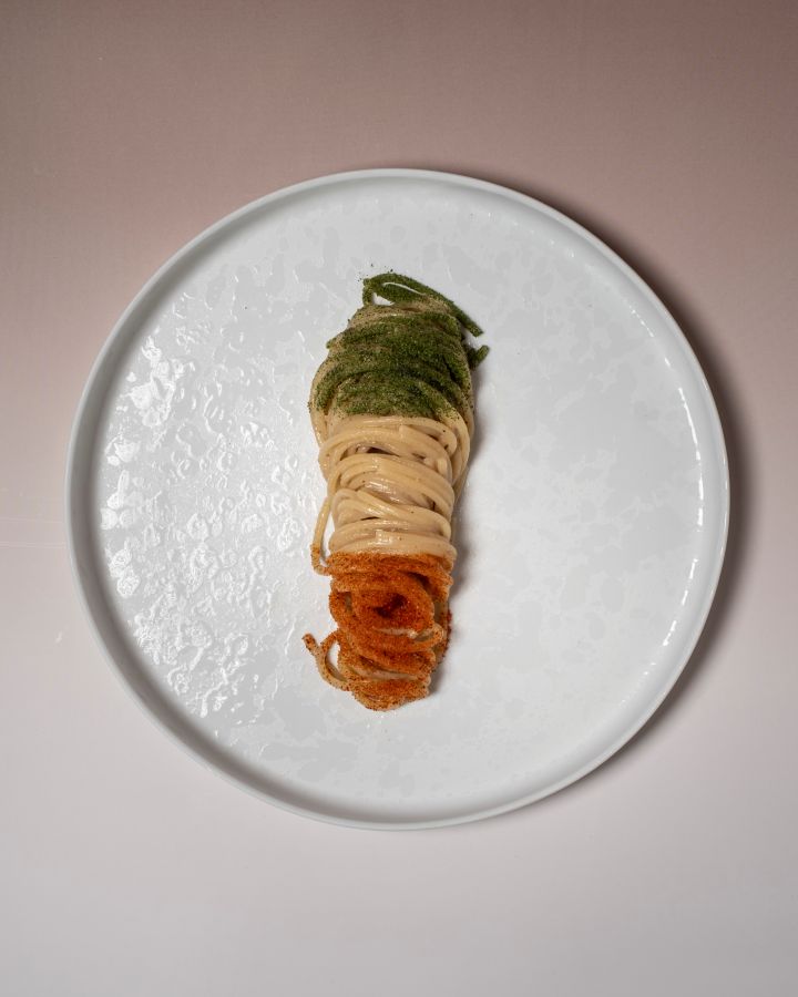 Nel menù non mancano i piatti di pasta secca, tra cui gli Spaghetti “Tricolore”, creati per il progetto Barilla Al Bronzo. È un piatto che unisce idealmente Nord e Sud: la pasta è condita con una base di burro e alici e completata con polvere di prezzemolo e di pomodoro, disegnando i colori della bandiera italiana.