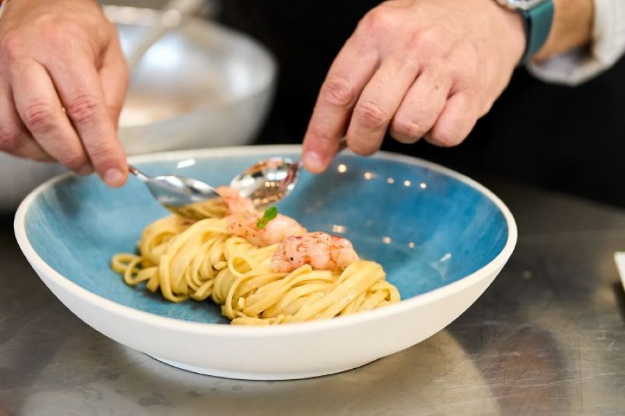 In riferimento alla pasta Barilla Al Bronzo racconta: «Ho scelto la pasta trafilata al bronzo per curiosità e dopo averla provata ho apprezzato il fatto che tiene molto la cottura, si presenta bene anche al sapore». Una certezza nel suo menu che si potrebbe definire new classic. «Senz’altro mi piace il mezzo rigatone e lo utilizziamo con il sugo di pesce e con l’astice. Abbiamo fatto lo spaghetto al gambero rosso di Mazara e poi i mezzi rigatoni con il pesto con la bottarga, altro elemento che il territorio ci regala tutto l’anno». Siamo in Sicilia, non bisogna dimenticarlo, qui la pasta gioca in casa in quello che era il granaio d’Europa per gli antichi Romani. Ancora oggi però, in luoghi come Marina di Modica, si celebra il sodalizio che ha reso celebre l’Italia nel mondo, tra pasta e mare. Un modo per raccontare il patrimonio ittico siciliano valorizzandone colori e profumi.