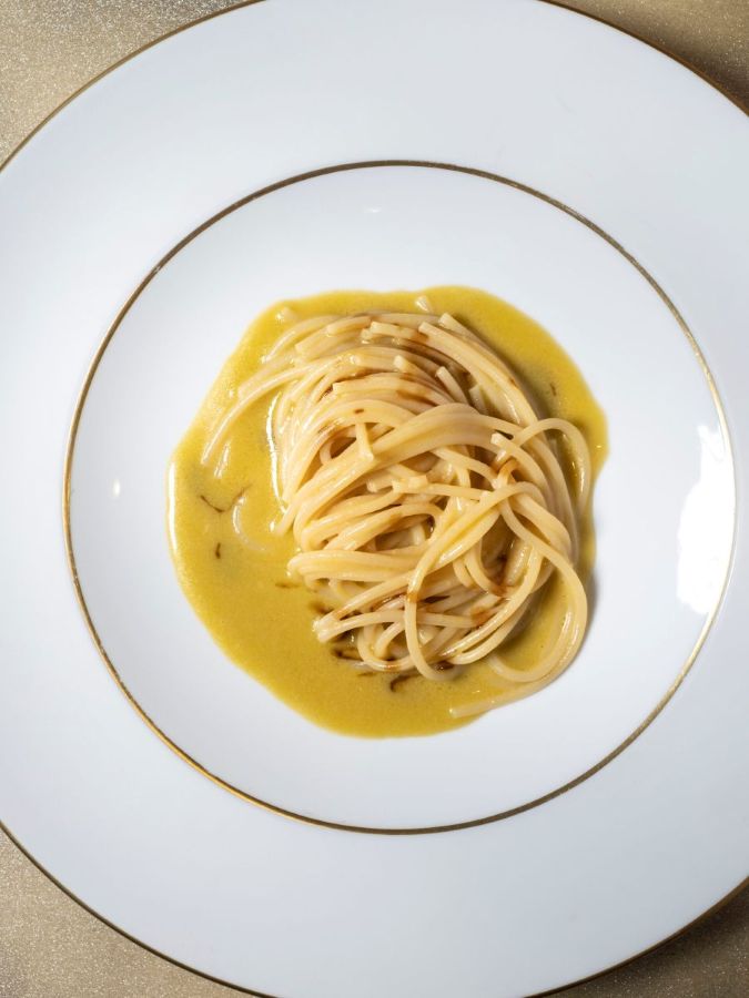 I pomodori vengono fatti colare per 2 giorni in modo da raccogliere la loro acqua che dà la parte fresca e acidula; la pasta viene cotta parzialmente su brace di foglie d’olivo, coperta sotto una campana che ne preserva il fumo dando sapore di affumicato, e finita di cuocere in acqua di pomodoro. Un omaggio alla terra bolgherese di olivi e ortaggi, con il plus della mantecatura finale in burro, in ricordo degli spaghetti al pomodoro della nonna di Fabrizio, il cromatismo tenue ed elegante cui corrisponde per contrappasso lo spettro gustativo intenso di brace e di pomodoro crudo, affumicato e fresco.