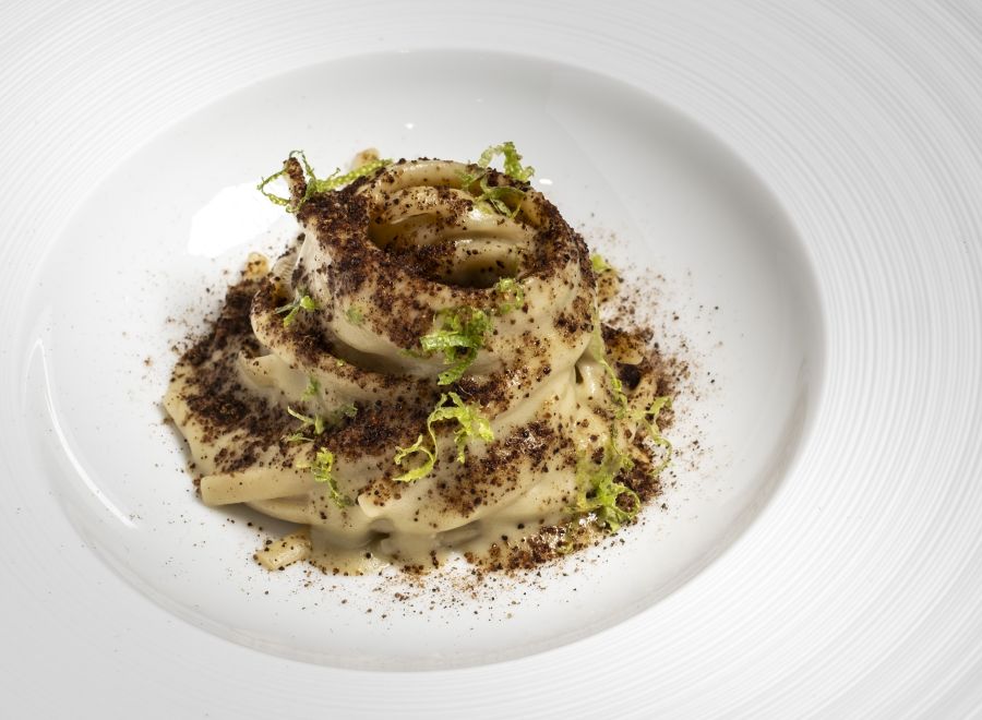 Il lime interviene come una luce mediterranea improvvisa, un taglio di Godard che rompe l’equilibrio per renderlo più vivo. Il koji tostato, infine, aggiunge una profondità umami stratificata: richiama la nocciola, il pane caldo, la fermentazione come tempo che lavora in silenzio. La linguina, grazie alla sua tenuta e alla capacità di legare il fondo, diventa il vero filo narrativo del piatto, trasformando la semplicità apparente in complessità controllata.
