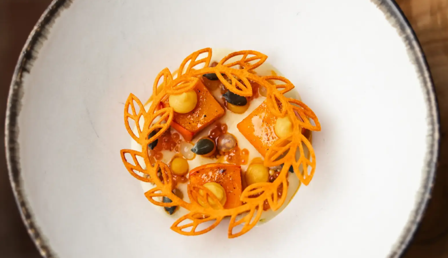 La sua è una cucina di sottrazione. I piatti seguono la stagionalità e cambiano con regolarità, partendo spesso da pochi ingredienti, riconoscibili, lavorati con precisione tecnica e senza sovrastrutture. Il vegetale ha un ruolo centrale, non ideologico ma strutturale: lattughe, erbe, ortaggi di stagione diventano elementi portanti del menu, non semplici contorni. La carne e il pesce entrano in scena quando servono, sempre in equilibrio.
