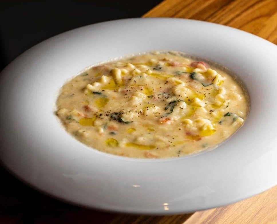 Il legame con la pasta nasce dai ricordi di casa. Il più forte è la pasta e ceci di suo padre: ceci messi a bagno la sera prima, cotture lente, formati di pasta sempre diversi, in base agli avanzi. E poi lo spaghetto alle vongole della vigilia di Natale, oggi riproposto con una tecnica più leggera, senza soffritti aggressivi. Nel menu attuale alcuni piatti rappresentano pienamente la sua mano. Il Raviolo burro e salvia, ripieno di parmigiano, gli gnocchi ripieni di provola affumicata, bolliti e poi grigliati stile gyoza, serviti con un ragù napoletano e infine l’immancabile spaghetto, oggi in carta in una versione con scorfano e mandarino. Tre ingredienti sfruttati in ogni parte, dalla marinatura ai fondi.
