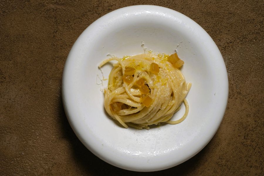 Per il progetto Artisti Al Bronzo di Barilla, Gaglione ha scelto lo Spaghetto Quadrato, che ha interpretato con pecorino romano e limone candito, ed è poi rimasto stabilmente in menu. Abituato a usare monograni e pastifici artigianali, non si aspettava un risultato così convincente: cottura stabile, tenuta perfetta anche nei servizi più intensi e grande capacità di assorbire sughi. «È diventato il mio spaghetto preferito», racconta. Una pasta che, nella sua semplicità, gli permette di esprimere al meglio la cucina che ama: pochi ingredienti, tanta precisione e nessuna complicazione superflua.