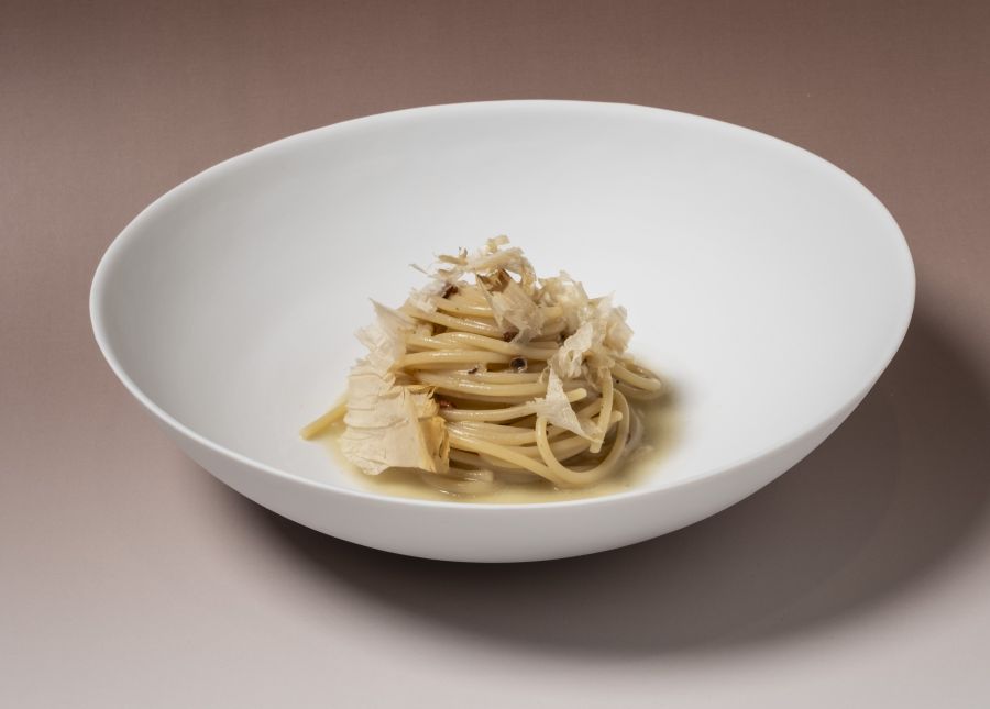 Ma uno dei classici che meglio incarna il senso di appartenenza a una terra e insieme il dinamismo di un viaggio tra sapori che si contaminano e si riuniscono in un unico piatto, è lo Spaghetto Al Bronzo Barilla con Pepe di Seichuan e Katsuoboshi. L’ispirazione orientale del ramen, con noodles e dashi, trova trasposizione nell’alveo mediterraneo con lo spaghetto di grano duro e il garum di alici che riporta all’antichità romana.
