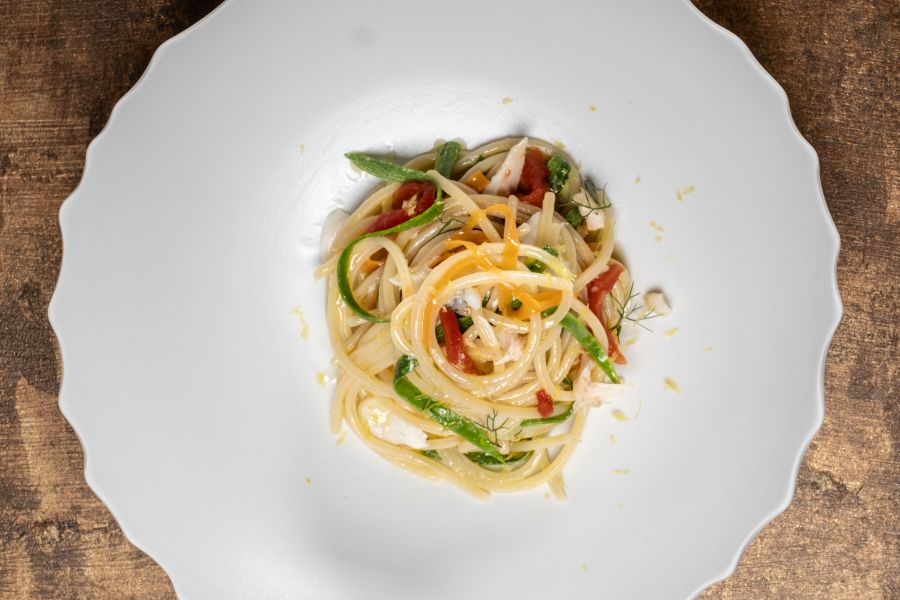 Ne è sintesi lo Spaghetto Quadrato Barilla Al Bronzo con coregone del lago, fili di zucchine e carote. Un piatto che non alza la voce, ma si impone per coerenza. La pasta, ruvida e porosa, diventa struttura e memoria; il coregone racconta l’acqua dolce del Garda; le verdure introducono una nota vegetale che illumina l’insieme. Tutto è calibrato, nulla è accessorio. Al Cortile del Gelso l’esperienza non si misura in effetti, ma in persistenza. È quel tipo di cucina che non cerca di essere ricordata nell’immediato, ma che riaffiora più tardi, come una frase letta con attenzione o una scena di cinema d’autore: quando il silenzio ne rivela finalmente il senso.
