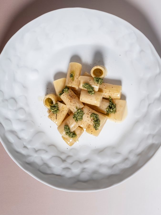 Mezzi rigatoni Barilla al Bronzo, pesto di erbe aromatiche (maggiorana, timo, origano, menta, basilico, santoreggia, timo limone) e machettö, brodo di pecorino di razza autoctona Brigasca e parmigiano per mantecare la pasta. Un’ode alla terra ligure e a chi se ne fa custode.